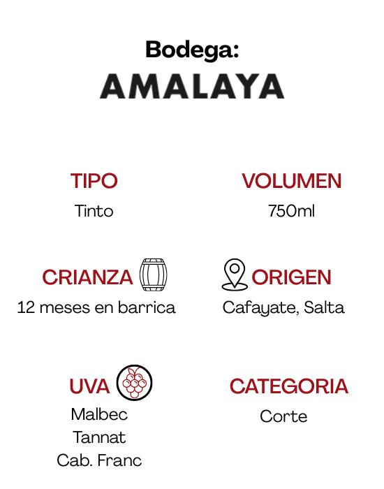 El vino es un blend compuesto por 85% Malbec, 9% Cabernet Franc y 6% Tannat.