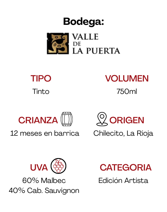 Con una crianza de 12 meses en barricas de roble francés y proviene de los Valles del Famatina, en Chilecito, La Rioja, a 1050 msnm.