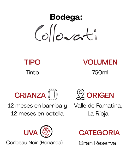 El Collovati Gran Reserva Bonarda es un vino tinto 100% Bonarda, proveniente de viñedos en el Valle de Famatina, La Rioja. Se cría durante 12 meses en barricas de roble, seguido de otros 12 meses de estiba en botella.