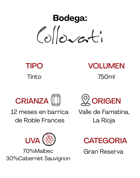 El Collovati Severino Gran Reserva Blend es un vino tinto de edición limitada, compuesto por un 70% Malbec y un 30% Cabernet Sauvignon.