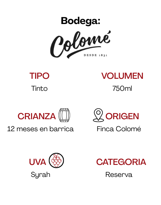 Las uvas provienen de la Finca Colomé, ubicada a 2.300 metros sobre el nivel del mar, en el Valle Calchaquí Superior.