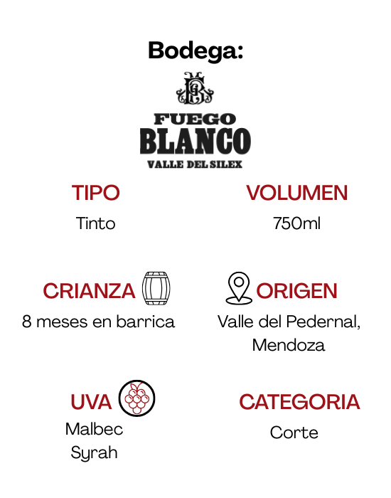 El vino es una mezcla de uvas Malbec y Syrah. La composición es 60% Malbec y 40% Syrah. Se madura en toneles usados de 1000 litros de roble francés durante 8 meses.