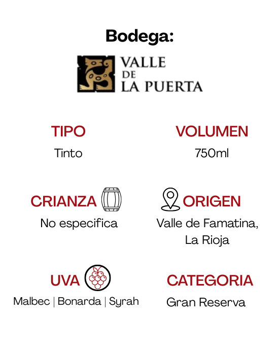 La Puerta Gran Reserva Blend es una mezcla de uvas Malbec, Bonarda y Syrah. El enólogo es Javier Collovati.