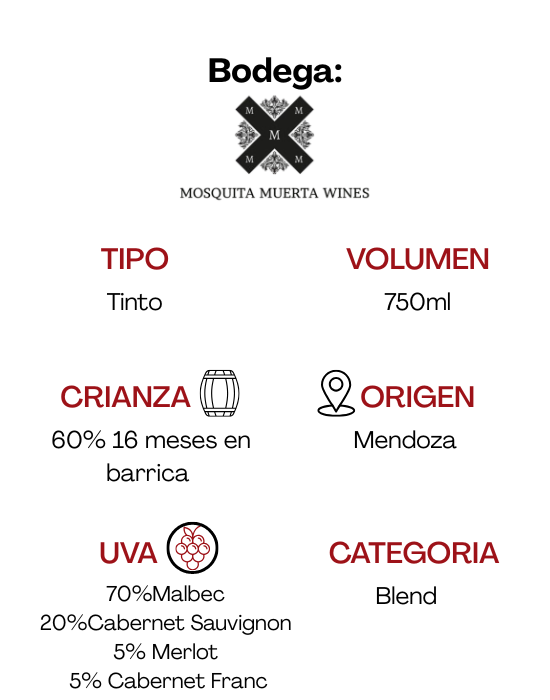 Notas de cata: Color rojo profundo con notas violáceas. En nariz es complejo y combina aromas frutados y especiados, con notas de roble, café y chocolate. En boca tiene una textura aterciopelada, taninos jugosos y firmes, con una acidez equilibrada y un final largo y elegante.